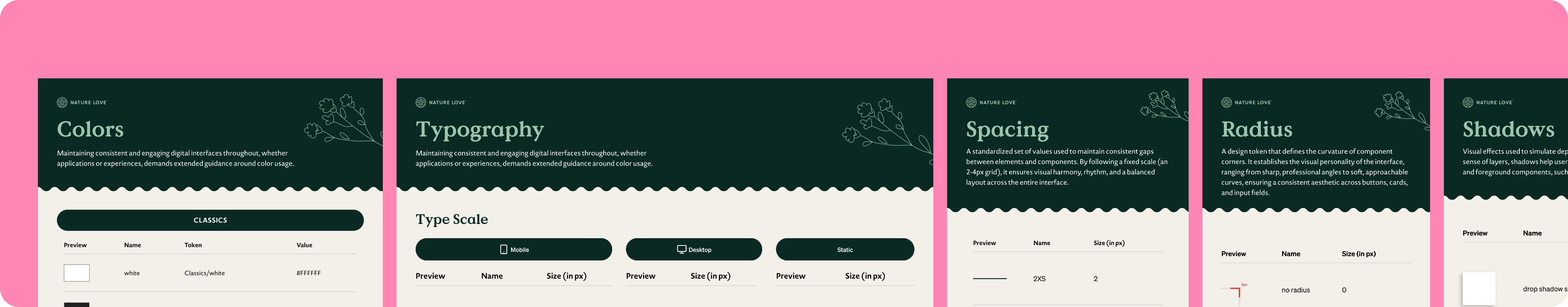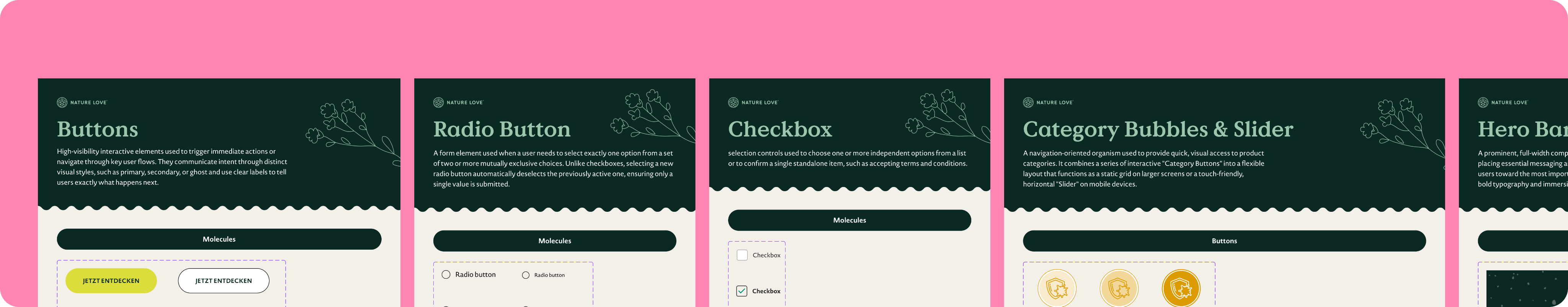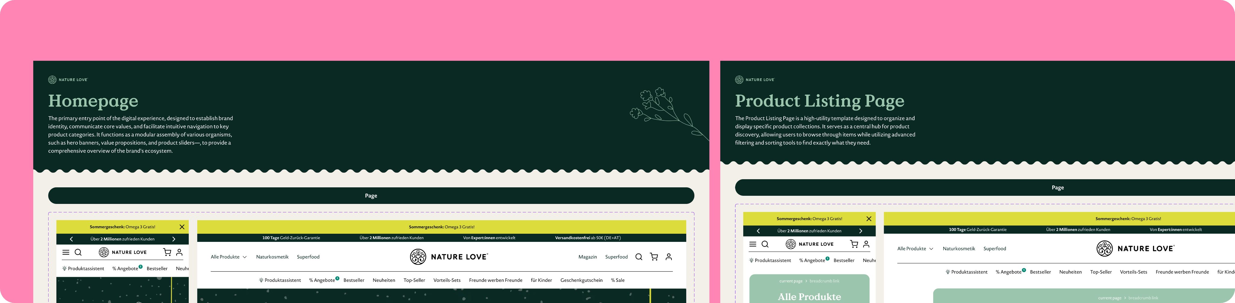 Nature Love und Natural Elements sind führende D2C-Brands für hochwertige und natürliche Nahrungsergänzungsmittel und sind Teil der Natsana GmbH.Zwei Marken, eine Vision: Skalierbare Designsysteme, die markenübergreifende Konsistenz sichern und den Designprozess effizienter gestalten. Durch die Systematisierung wiederkehrender Elemente schaffen wir wertvolle Zeit für das Wesentliche: die kontinuierliche Optimierung der User Experience.In diesem Projekt durfte ich eigenständig als Freelancerin den Aufbau beider Designsysteme übernehmen und stand dabei im engen Austausch mit der Senior CX/UX-Designerin Seyma Nur Ermis von Natsana.