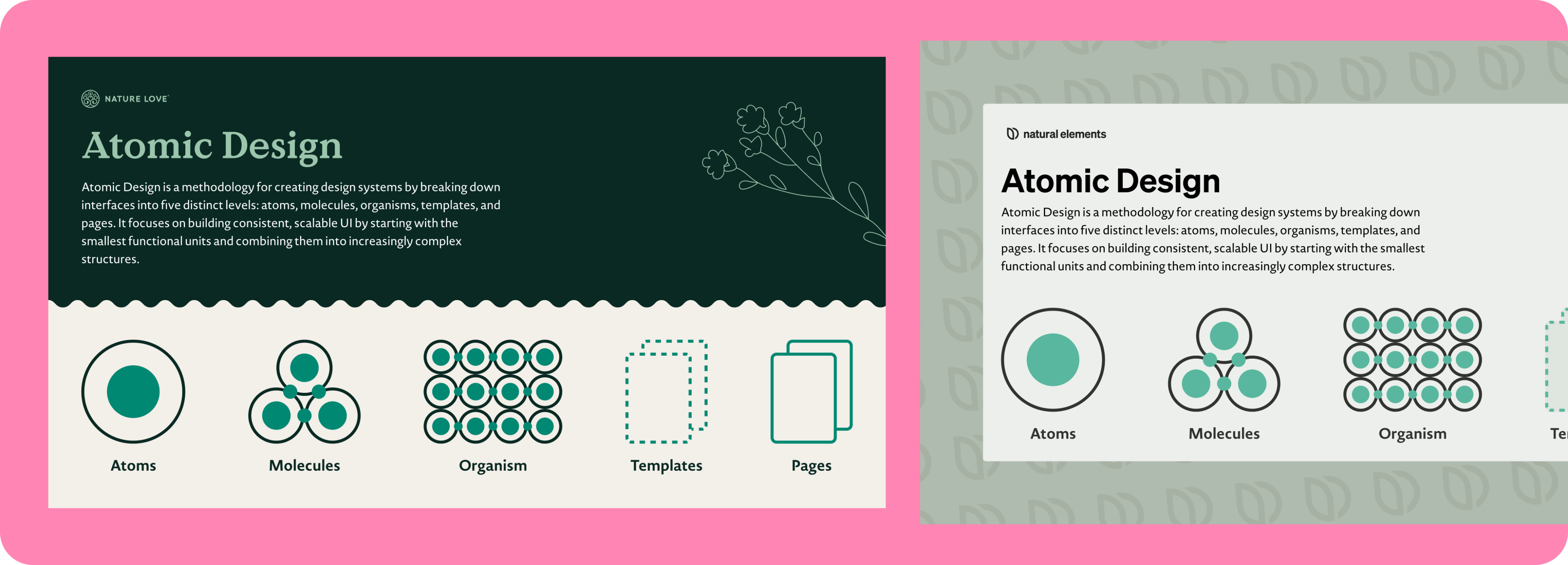 Die Besonderheit dieses Projekts lag darin, nicht auf der grünen Wiese zu starten, sondern auf Basis von bestehende Designs der Shops von Nature Love und Natural Elements zu arbeiten. Die Designsysteme wurden so konzipiert, dass sie sich an Standards wie das Atomic-Design-Prinzip, Variablen und Tokens halten, gleichzeitig aber flexibel bleiben: Wo starre Regeln die bestehenden Live-Designs behindert hätten, wurde Pragmatismus priorisiert.